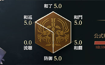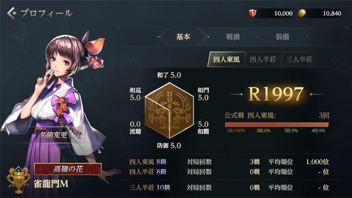 東風 / 半荘 / 三麻 の各モードの詳細戦績と、レーダーチャートで