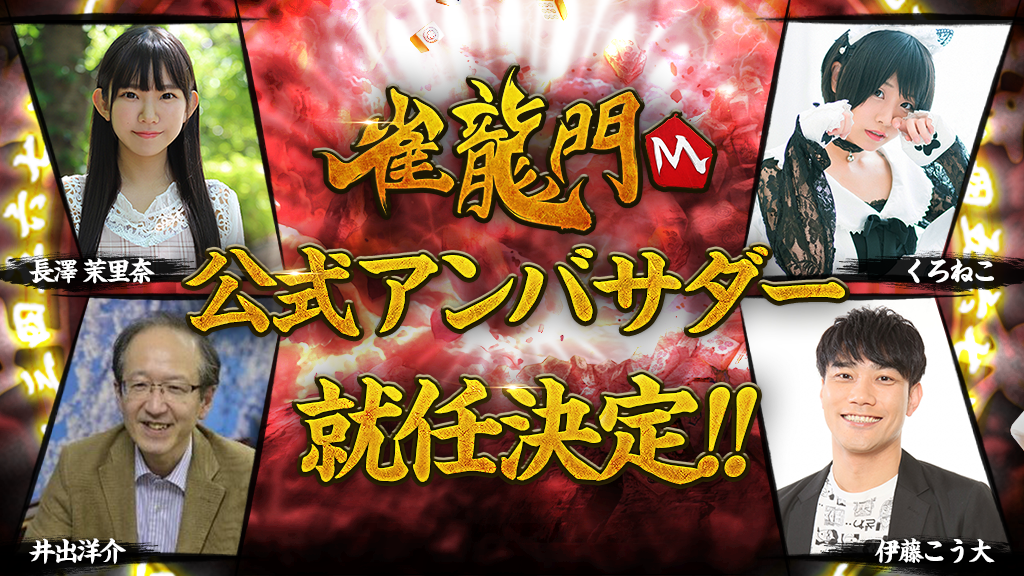 雀龍門M公式アンバサダーに次の4名が就任いたしました! ・長澤茉里奈(タレント) ・伊藤こう大(こりゃめでてーな) ・井出洋介(プロ雀士) ・くろねこ(コスプレイヤー) 今後、雀龍門Mの魅力を伝えるべく、公式YouTubeチャンネルでの番組放送など、 さまざまな企画が進行中です!今後の展開にご注目ください!
