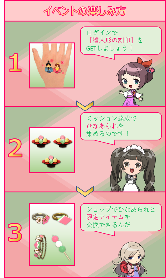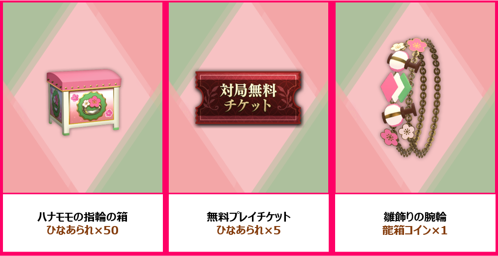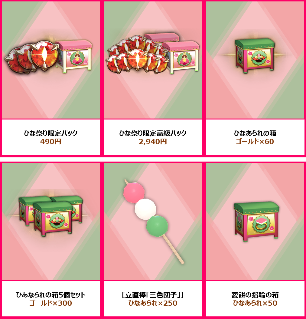 ※「ひなあられ」「おひなさまの箱」「ひなあられの箱」は、イベント期間終了時に削除されます。