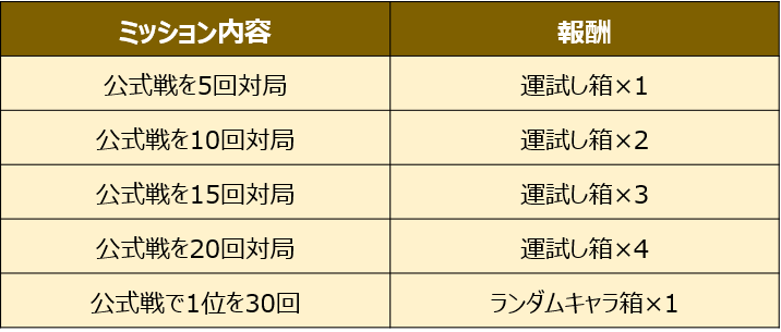 「公式戦を20回対局」のミッションをクリアすれば運試し箱が合計10個手に入り、最大1000ゴールド獲得のチャンス!