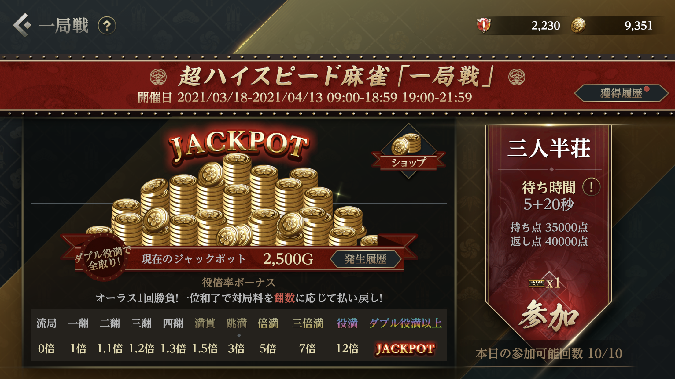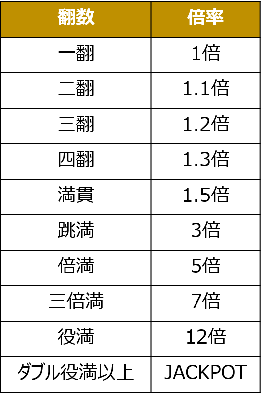 オーラスから対局が始まり、和了の翻数に応じてゴールド大量獲得のチャンス!