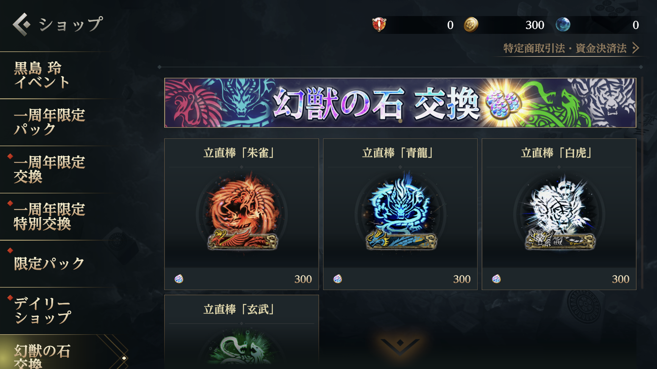 「幻獣の石交換」では、一周年イベントと同時に実装されたエフェクト付きの立直棒などのアイテムを「幻獣の石」と交換することができます。