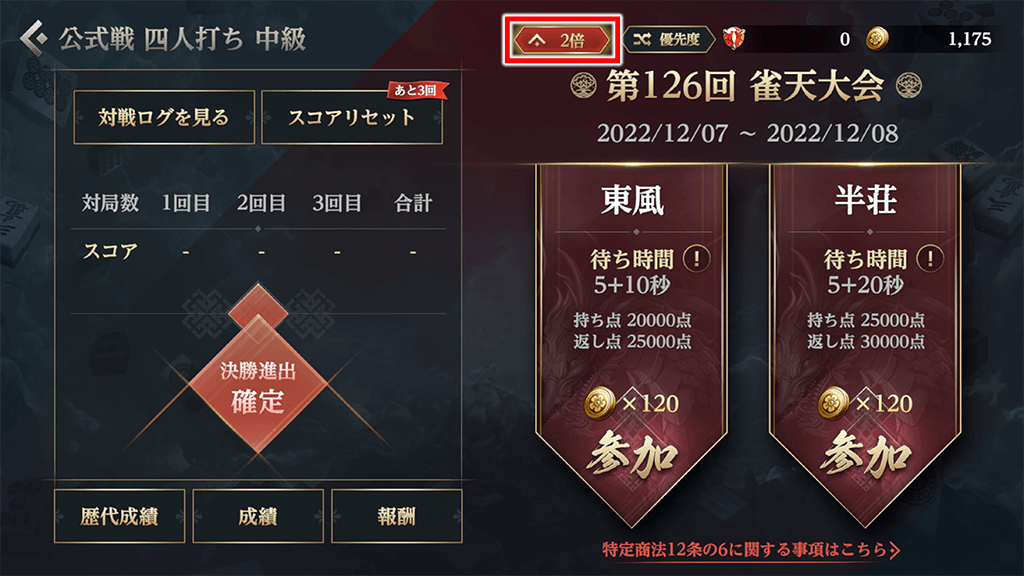 公式戦中級卓以上で場代を通常の2倍消費すると、1回の対局で対局報酬や、段位経験値が2倍になります。※負けた場合は2倍減少します