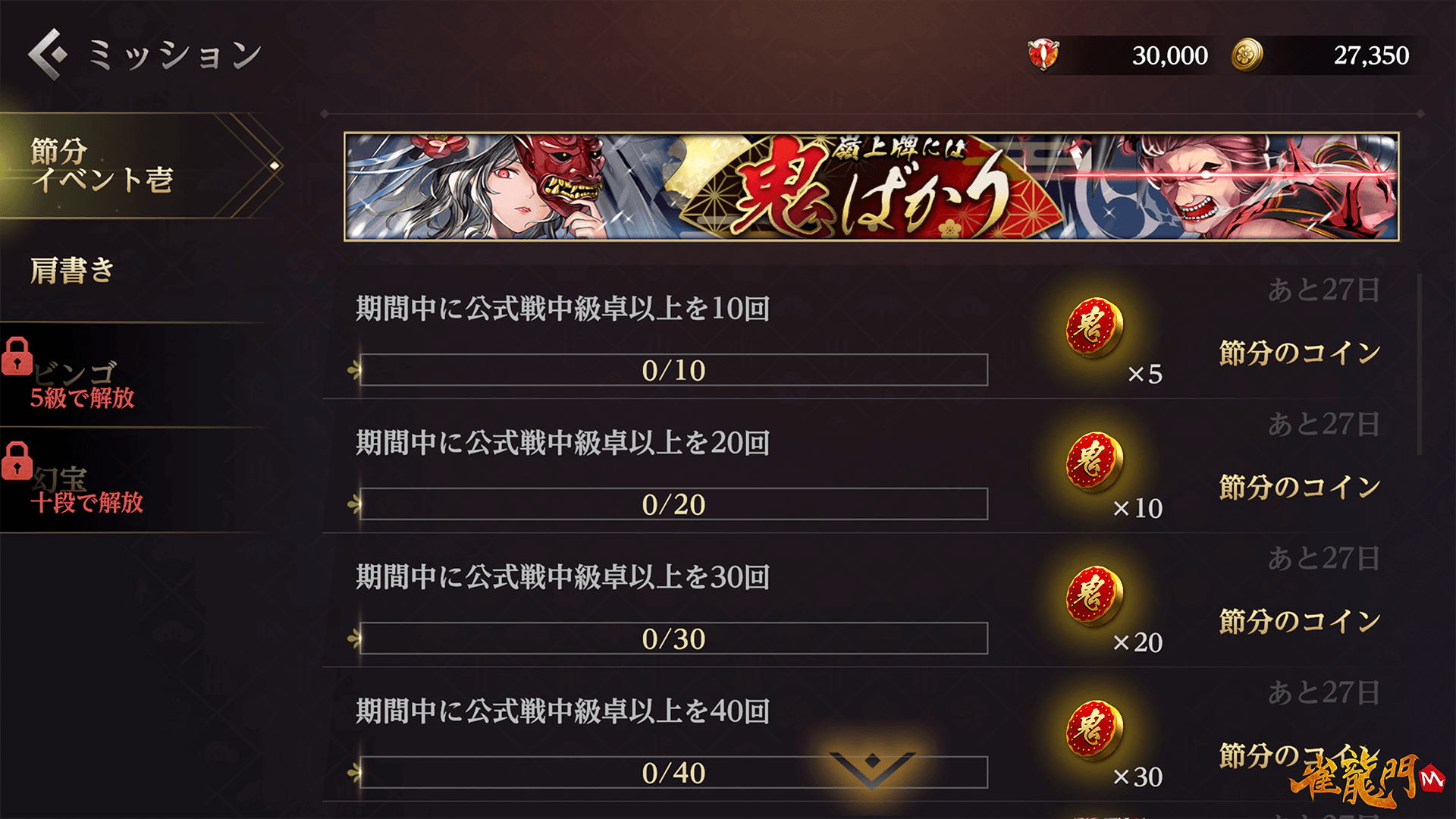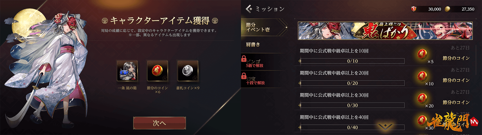 公式戦(中級卓以上)で獲得できる対局報酬の節分のコインが増加し、より多く節分のコインを獲得することができます!