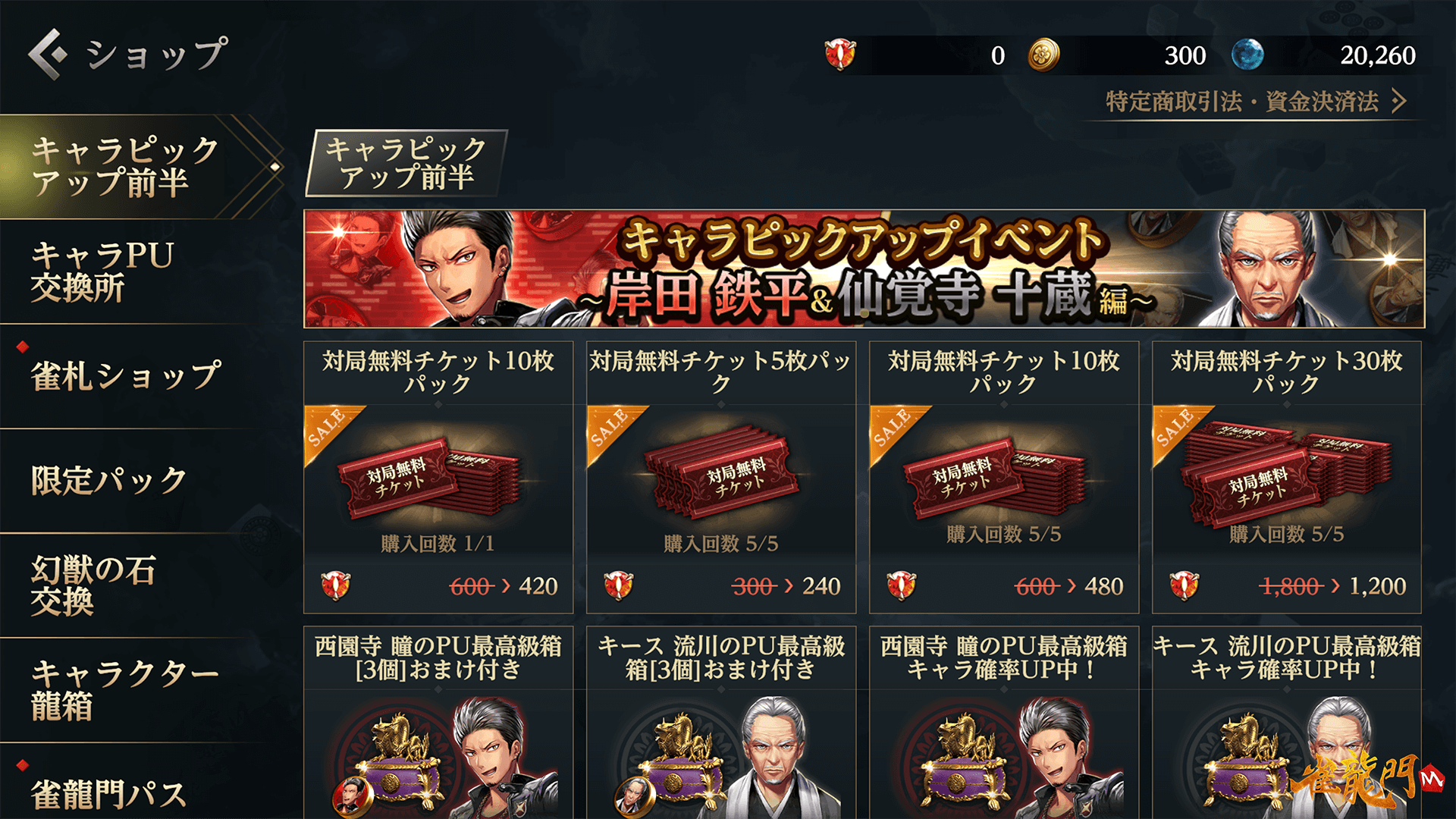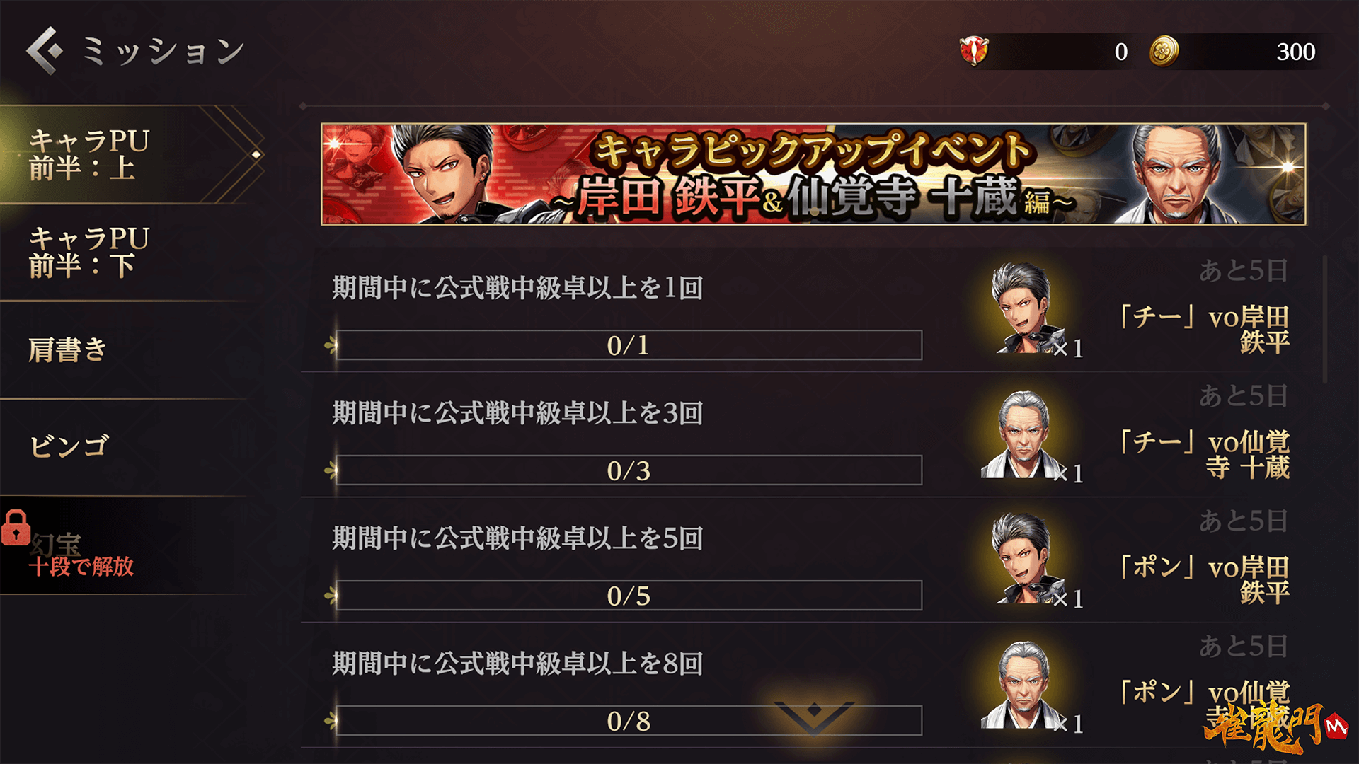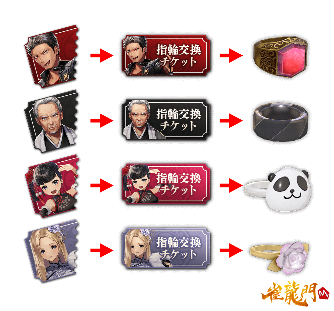 2枚集めるとショップで「岸田 鉄平」、「仙覚寺 十蔵」、「メイシン」、「メイファ」のキャラいずれか1体と交換できます。