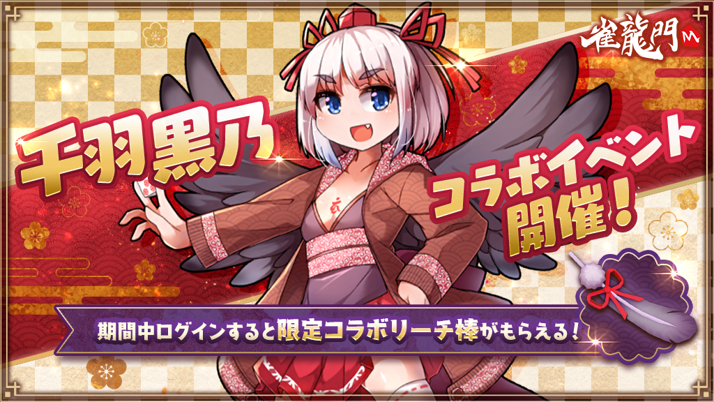 キャンペーン期間中に雀龍門 Mにログインいただくと、千羽黒乃さんをモチーフとした復刻コラボアイテムのリーチ棒「千羽黒乃の羽根」 が獲得できます!