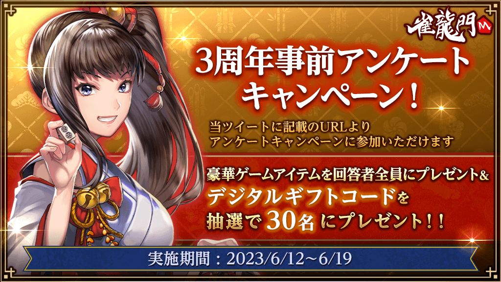 お問い合わせの際は冒頭に「雀龍門M3周年事前アンケート」と記載してください。