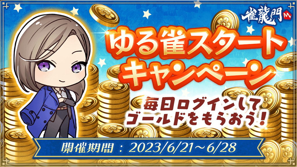 キャンペーンの期間中、雀龍門Mにログインすると1日1回プレゼントボックスに30ゴールドをプレゼントいたします。