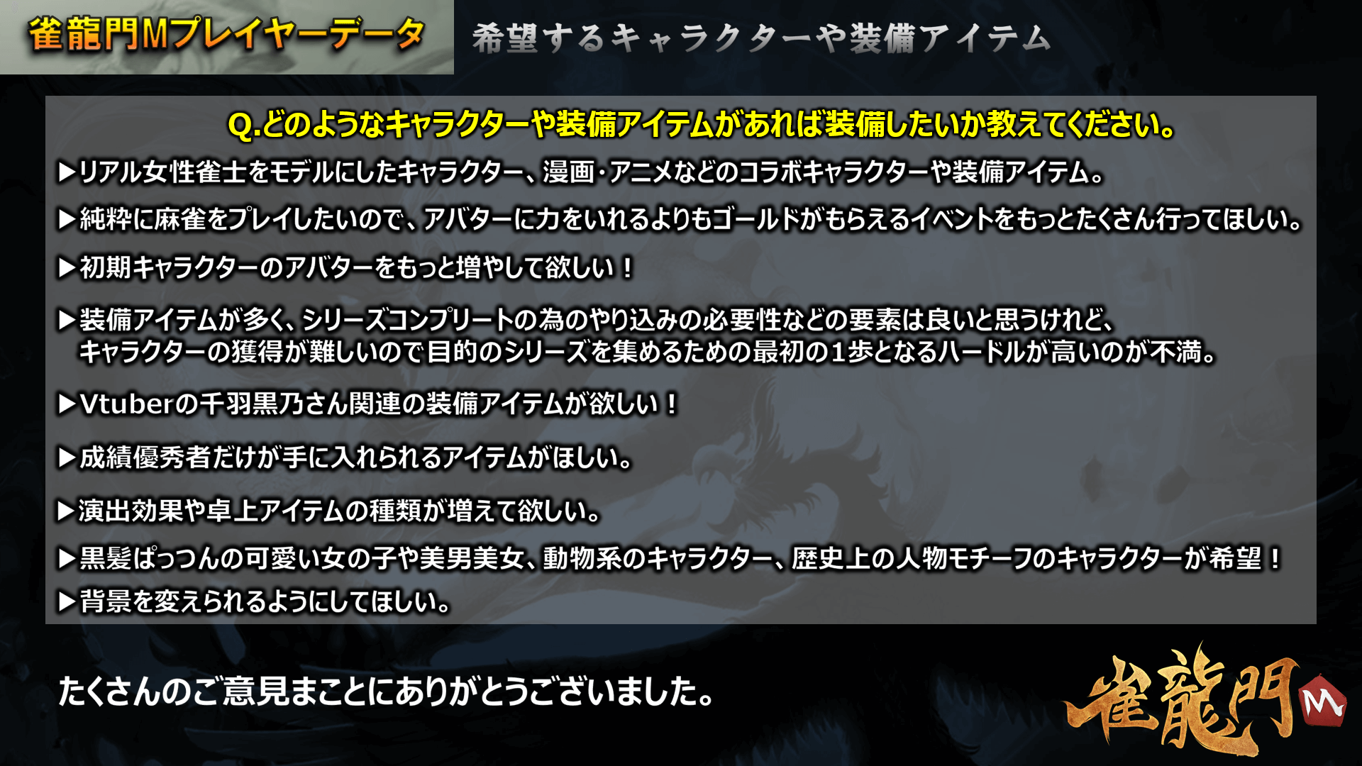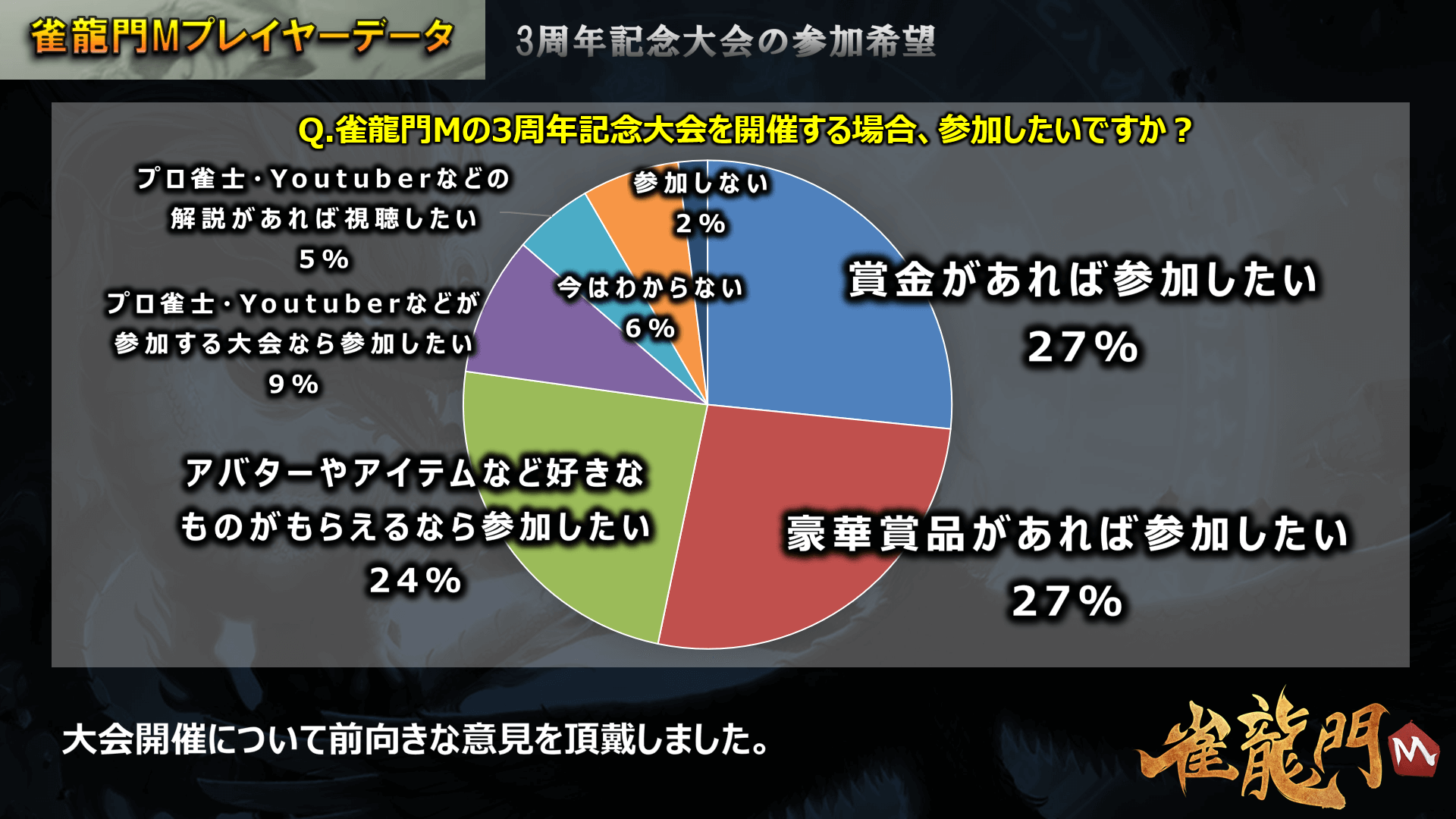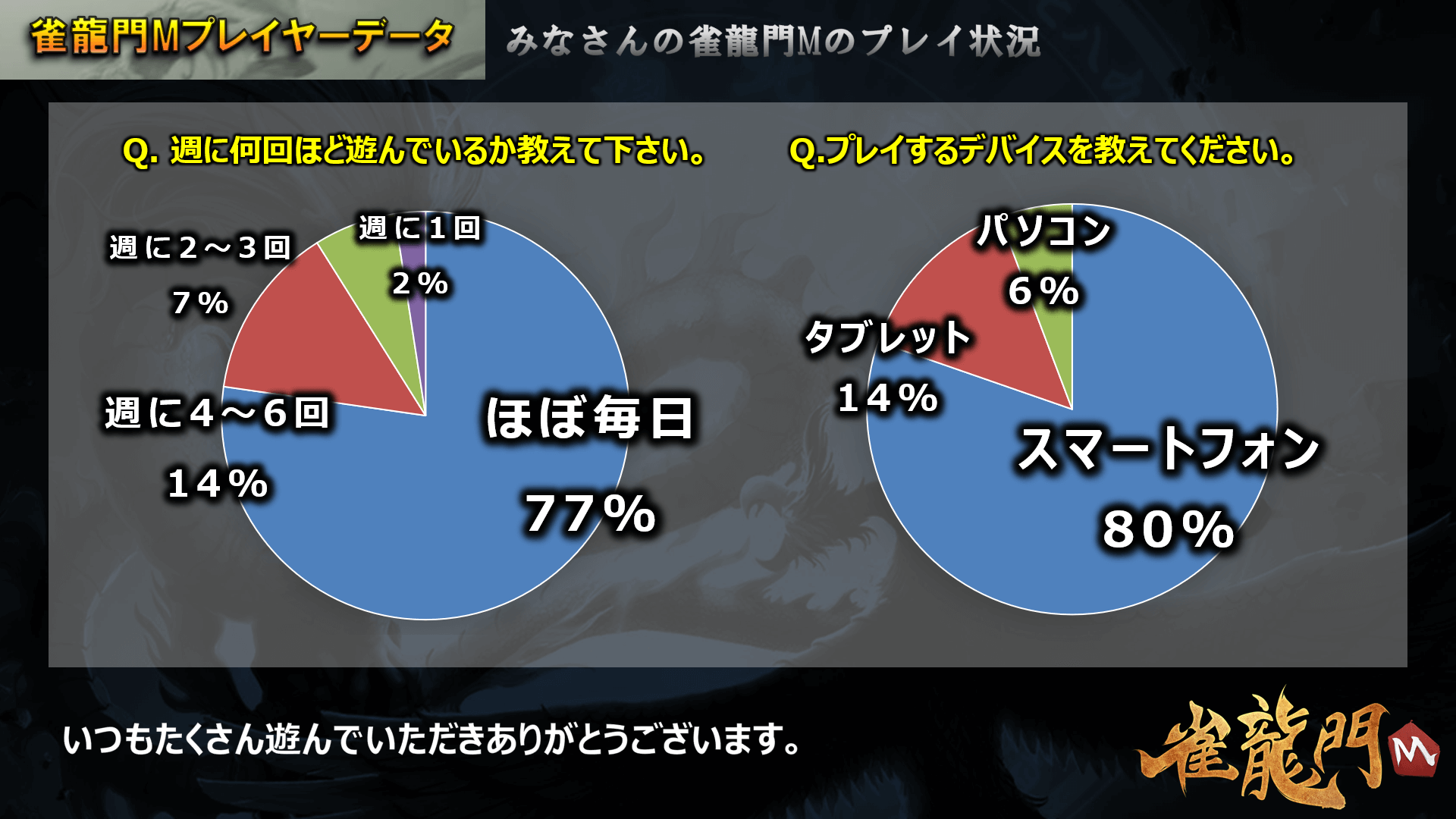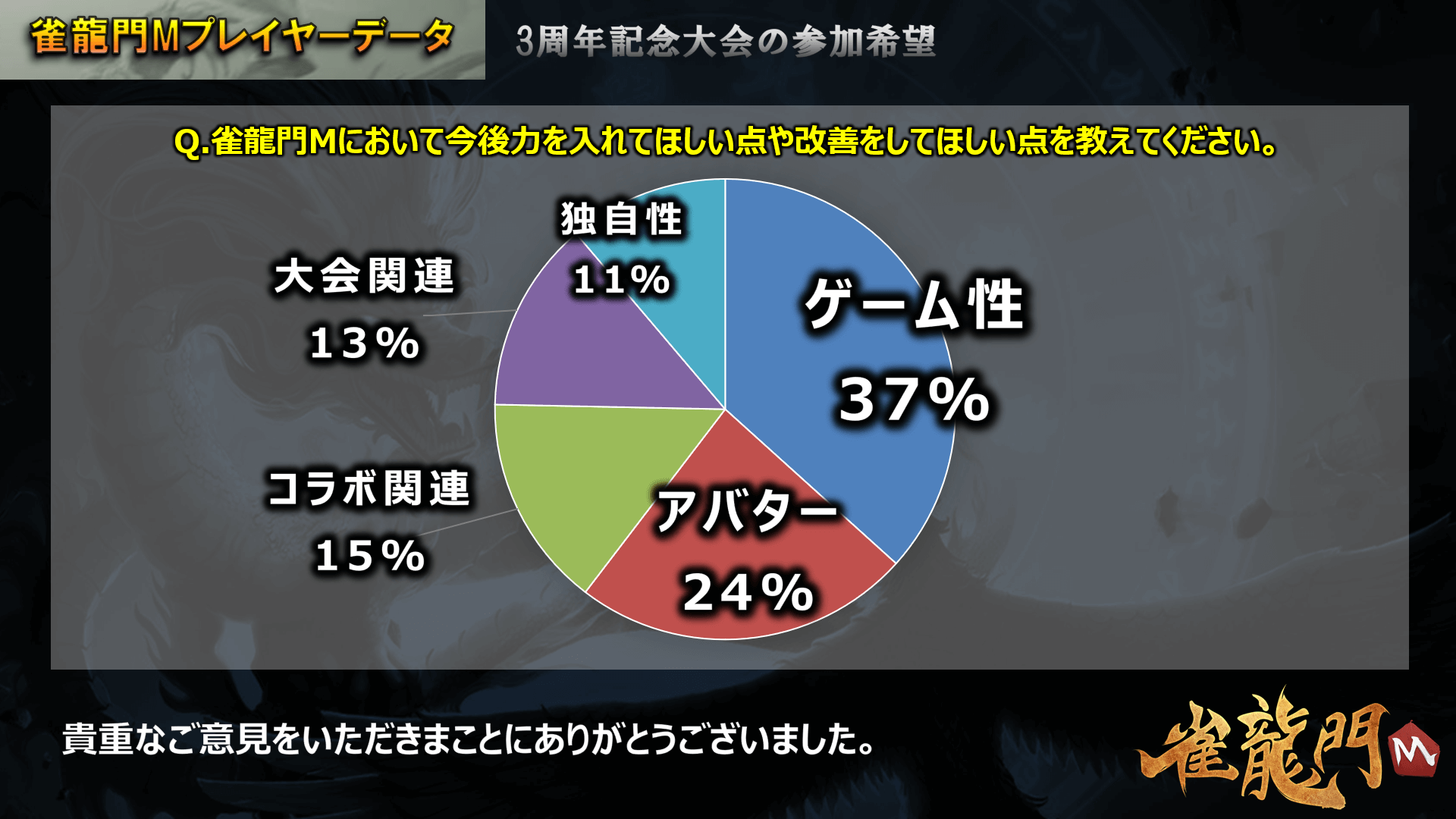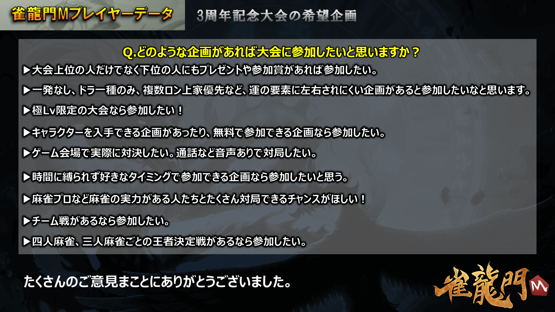 雀龍門M3周年事前アンケートの結果をご紹介いたします。
