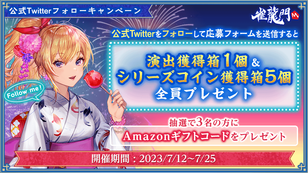雀龍門M公式Twitterアカウントではゲーム内アイテムやギフトコードがもらえるキャンペーンを毎月実施しております。この機会にぜひ雀龍門M公式アカウントをフォローしてください。