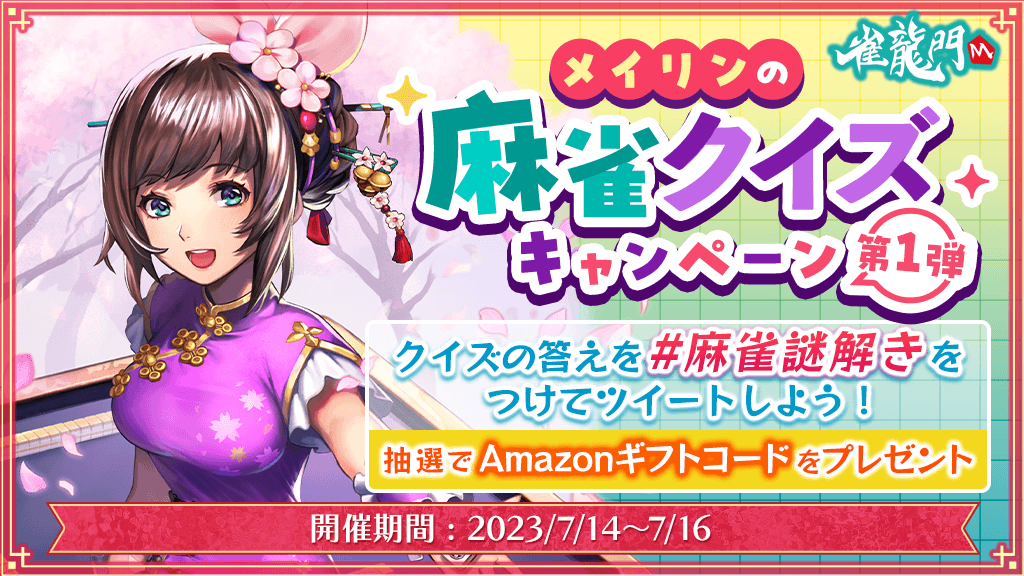 麻雀をお好きな皆様のために、雀龍門Mのキャラクター「メイリン」が麻雀にまつわるクイズを3週連続で出題します。クイズが解けた方には抽選でAmazonギフトコードをプレゼント!