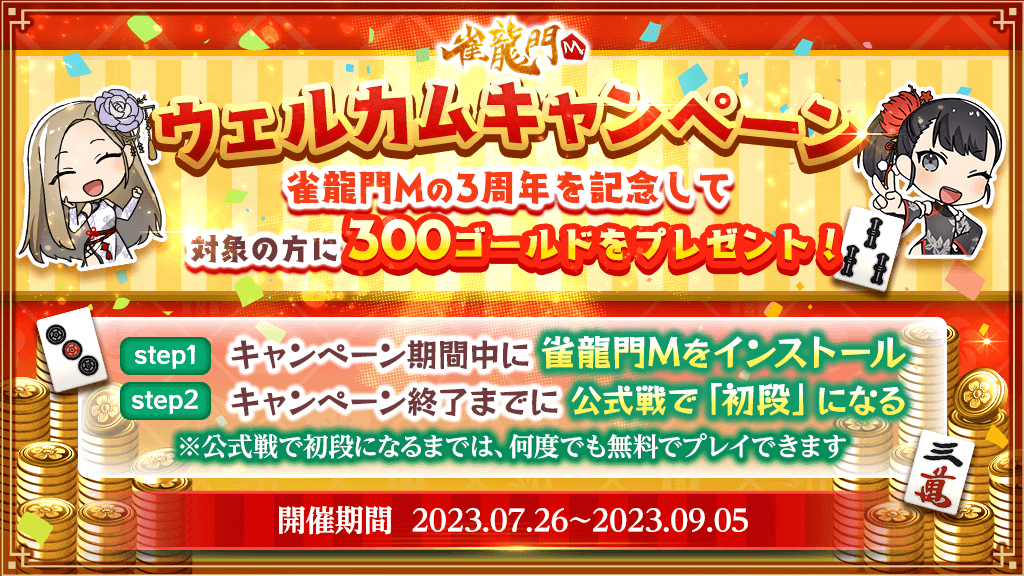 キャンペーン期間中に雀龍門Mをインストールし、キャンペーン終了までに公式戦で「初段」に到達すれば300ゴールドをプレゼントいたします。