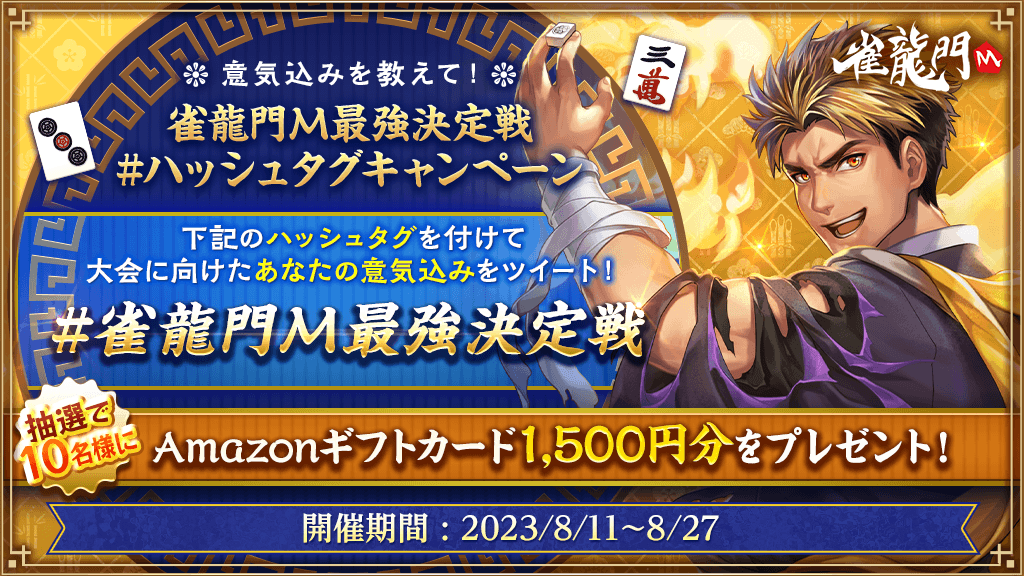 キャンペーン期間中に、「#雀龍門M最強決定戦」をつけて大会に向けたあなたの意気込みをツイートすると、1,500円分のAmazonギフトカードを抽選で20名様にプレゼントいたします。