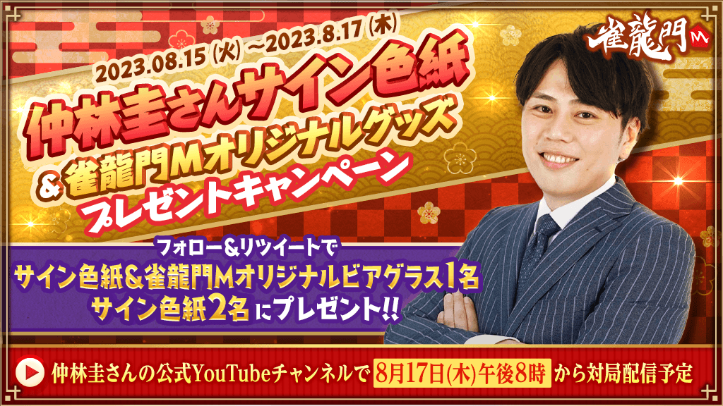 キャンペーン期間中に、当キャンペーン告知ツイートをリツイートすると抽選で「堀内正人」さん、「仲林圭」さん、「千羽黒乃」さん、「小林剛」さんのサイン色紙をそれぞれ抽選で2名(合計で8名)、サイン色紙と雀龍門Mオリジナルビアグラスのセットを1名(合計で4名) にプレゼントいたします。