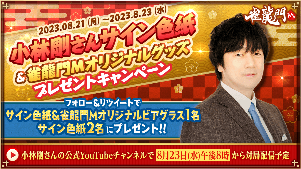 雀龍門M3周年記念最強決定戦に参戦する「堀内正人」さん、「仲林圭」さん、「千羽黒乃」さん、「小林剛」さんのサイン色紙と雀龍門Mオリジナルビアグラスが当たるリツイートキャンペーンを開催!