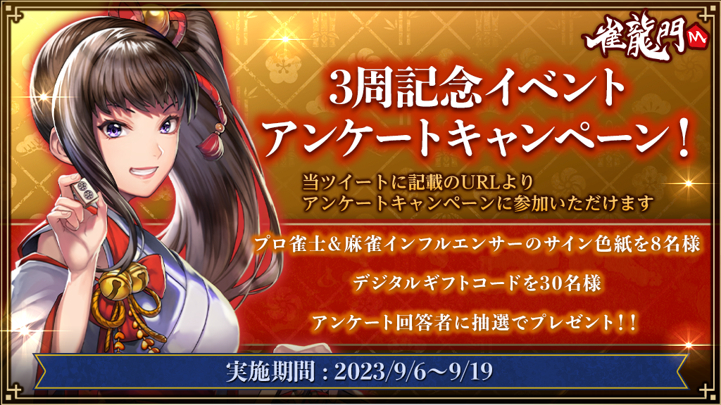 アンケートにご回答いただくと抽選で30名様にデジタルギフトコードと、最強決定戦のライブ配信を行っていただいたプロ雀士と麻雀インフルエンサーの方たちのサイン色紙を8名様にプレゼントいたします。