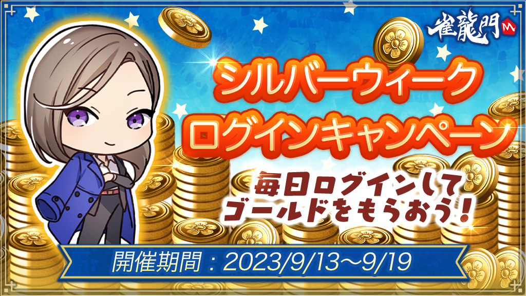キャンペーンの期間中、雀龍門Mにログインすると1日1回プレゼントボックスに30ゴールドをプレゼントいたします。