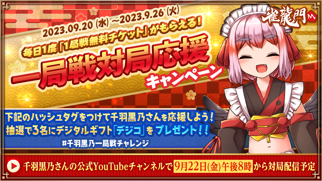 雀龍門M公式Xをフォローし、「#千羽黒乃一局戦チャレンジ」をつけて千羽黒乃さんを応援するメッセージをポストしてくれた方の中から抽選で3名様にデジタルギフト「デジコ」500円分をプレゼント