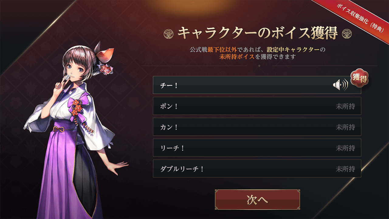 装備中のキャラクターの「未所持のキャラボイス」を公式戦上級卓プレイで最下位以外の順位時に入手できるようになります