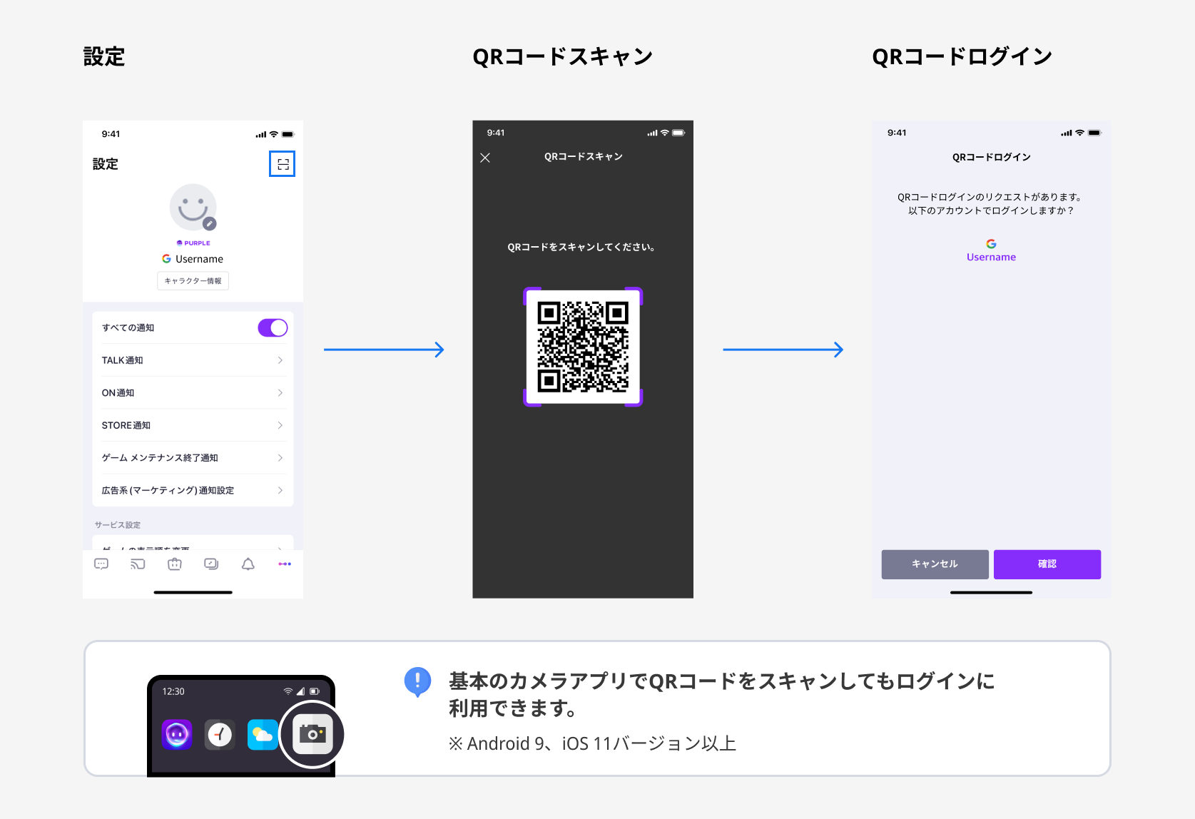 ・ QRコードログイン機能を利用するため、モバイル PURPLE(6.3.0以上)、PC PURPLE(1.23.1129.10以上)を最新バージョンにアップデートしてください。