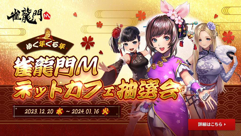 公認ネットカフェでの雀龍門Mのプレイを皆様によりお楽しみいただくために、「ゆく年くる年雀龍門Mネットカフェ抽選会」を開催いたします。