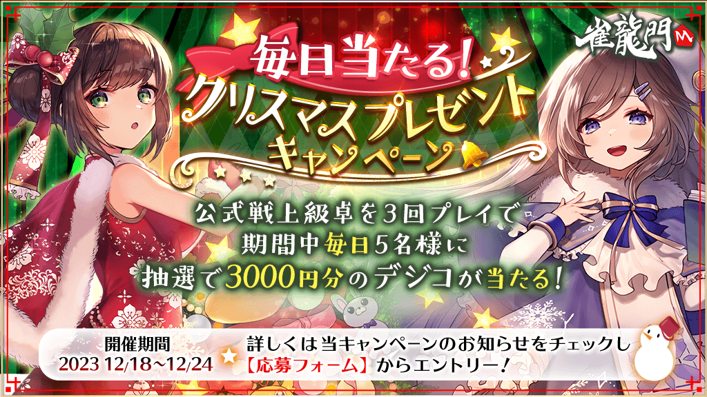 クリスマスシーズンに雀龍門Mをお楽しみいただく皆様のため、「毎日当たる!クリスマスプレゼントキャンペーン」を開催いたします。