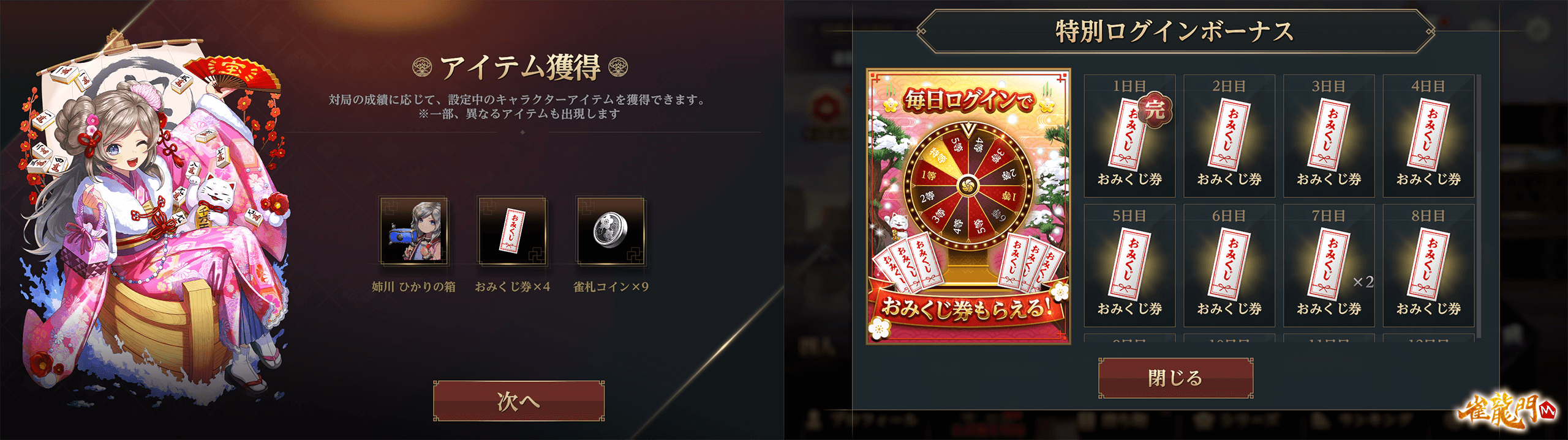 公式戦上級卓の対局報酬や、ログインボーナスからおみくじ券を集めよう!