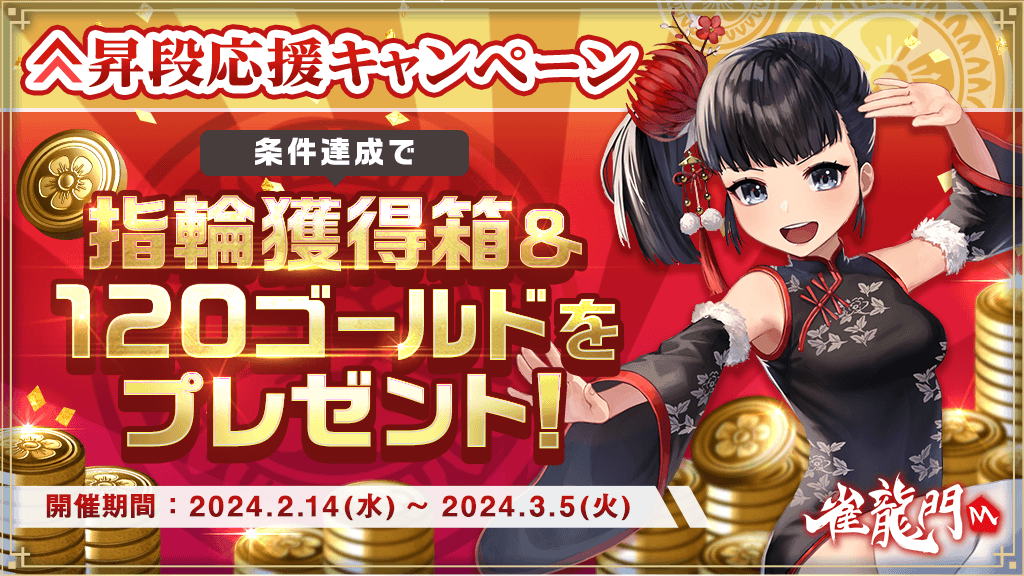 「雀龍門M」を始めたばかりの方や、いつもプレイしてくれている方への応援を込めて、「昇段応援キャンペーン」を開催いたします!