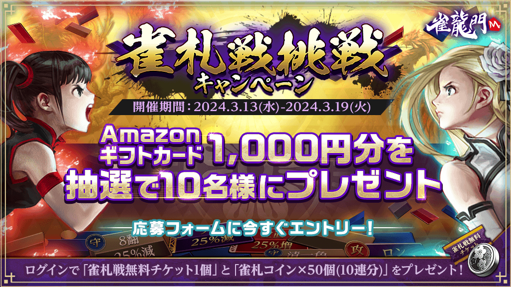 * 本キャンペーンに当選された方は、同時期に雀龍門Mが実施する他のキャンペーンに重複当選できない場合があります。