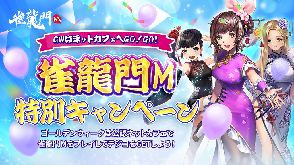 現在開催中の「GWはネカフェへGO!GO!プレイ時間に応じた特典GET!RPG&麻雀お得ウィーク」キャンペーンにつきまして、雀龍門Mではお得な特典として、「特別キャンペーン」を追加開催いたします。