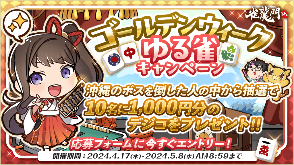 ⇒ゴールデンウィークゆる雀キャンペーン参加応募フォームはこちら