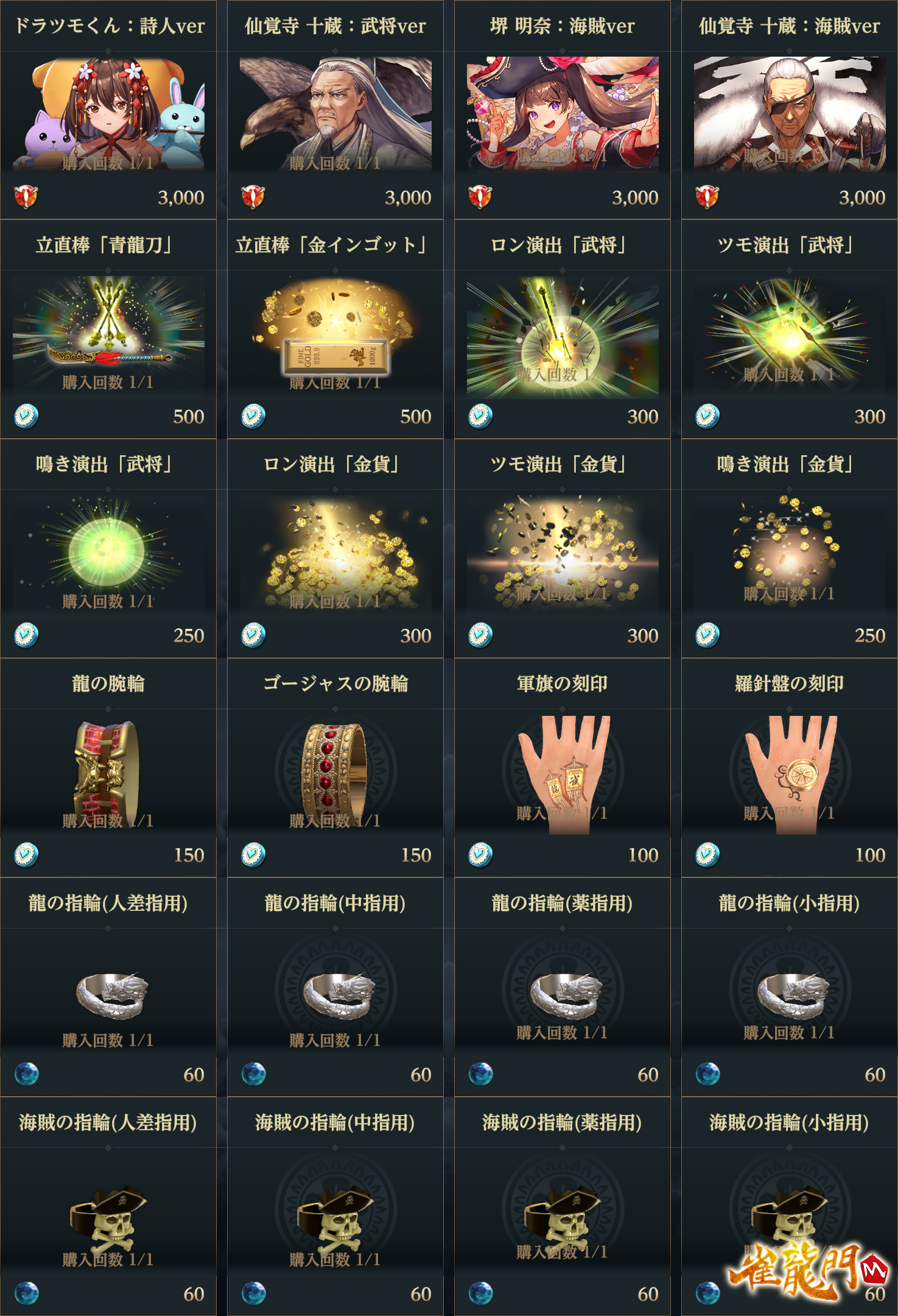 さらに昨年開催されたイベント「雀龍門演義〜我が打牌で一騎当千〜」や、一昨年開催された「出航!雀龍門海賊団」のアイテムを購入できる復刻ショップが登場!!