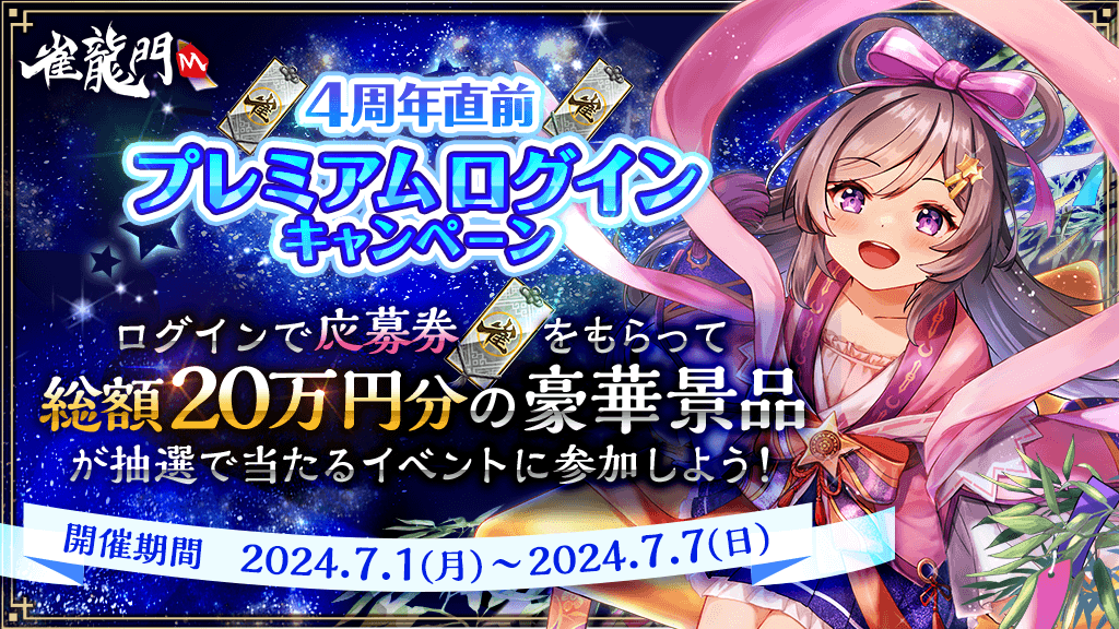 開催に伴い抽選イベントに参加できる応募券がもらえる「雀龍門M 4周年直前プレミアムログインキャンペーン」を実施します。