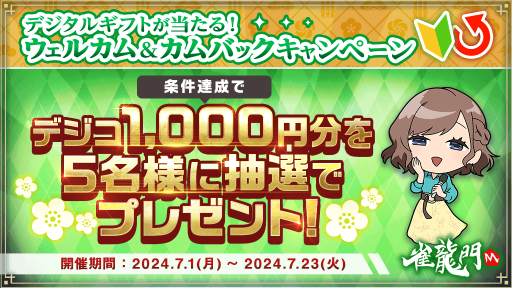 *本キャンペーンに当選された方は、同時期に雀龍門Mが実施する他のキャンペーンに重複当選できない場合があります。