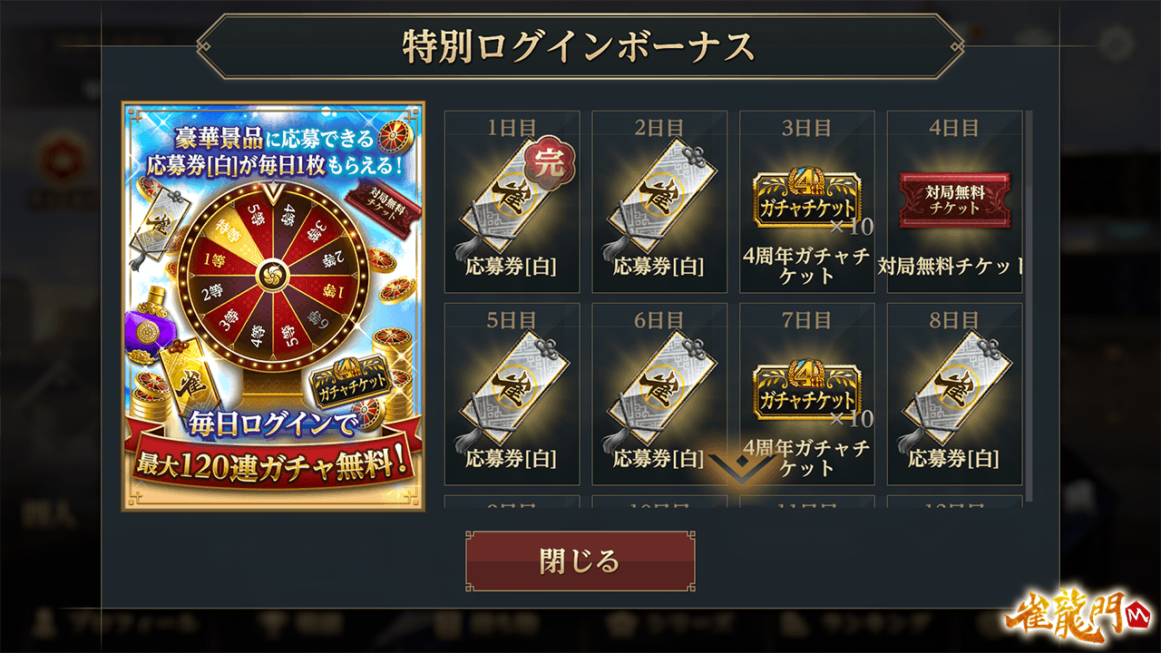 イベント期間中、雀龍門Mにログインするとログインボーナスとして最大120連分のガチャチケットをプレゼントします。