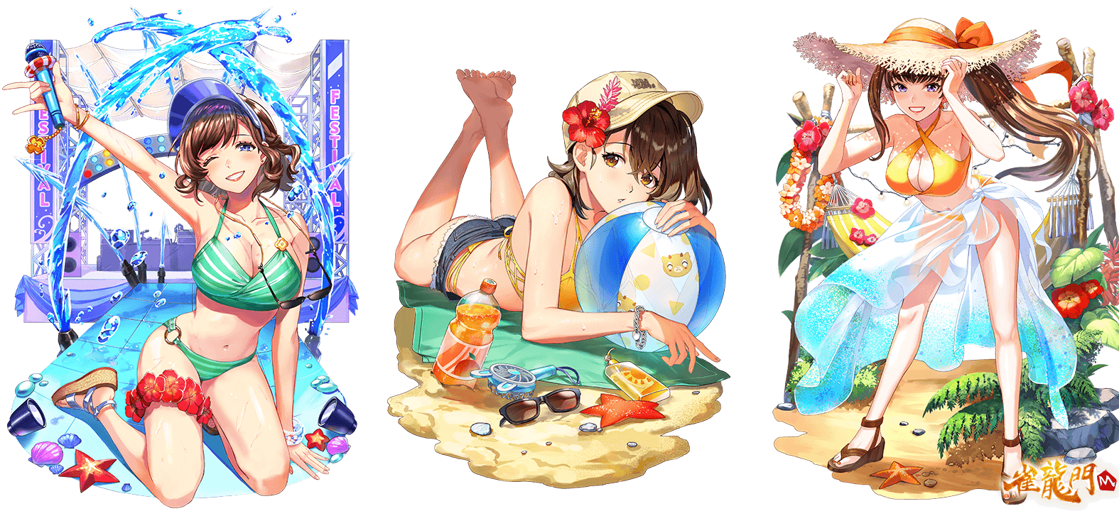 水着の装いをした雀龍門フェスティバル限定アバター「春風若菜:水着ver」(左)、「ドラツモくん:水着ver」(中央)、「堺明奈:バカンスver」(右)が登場します。