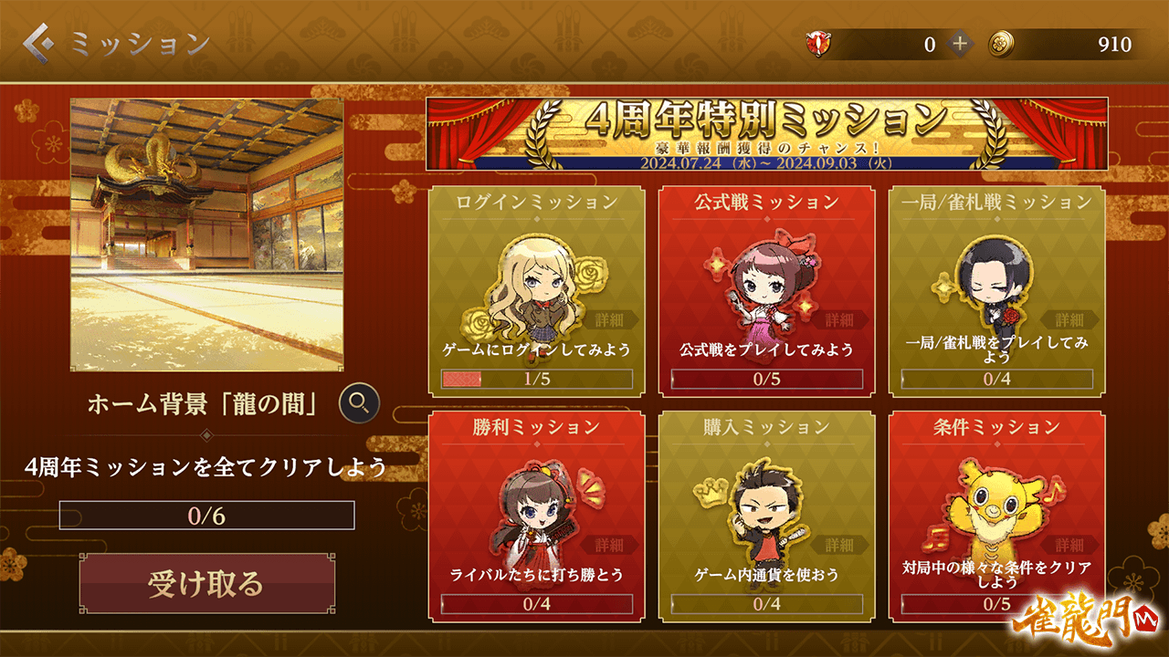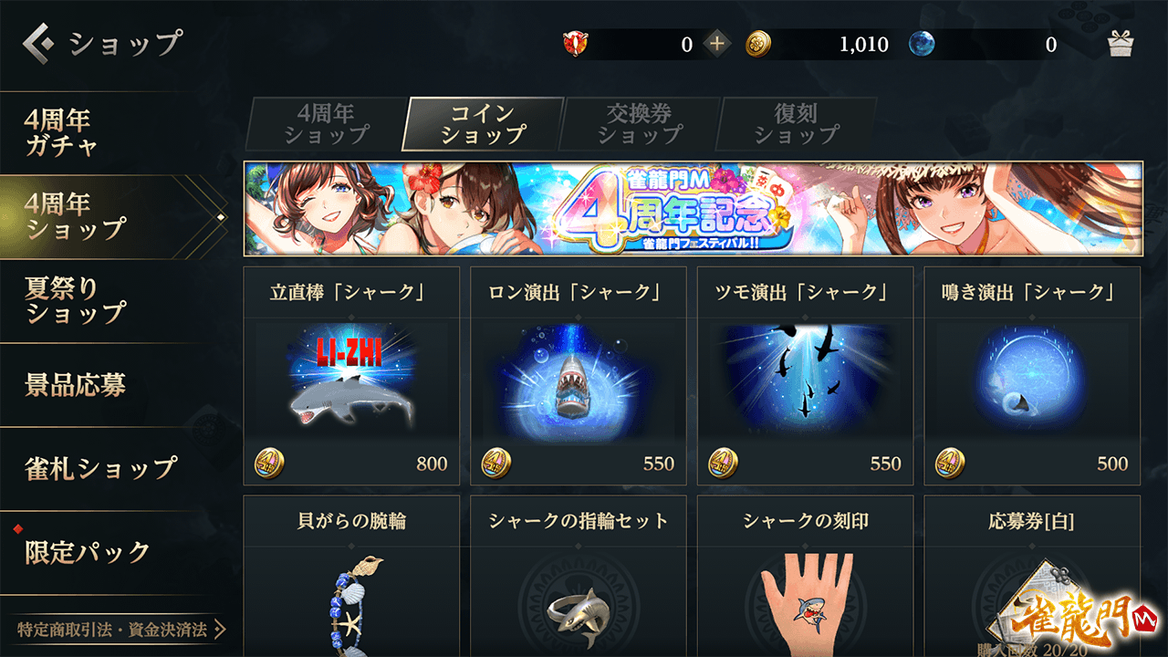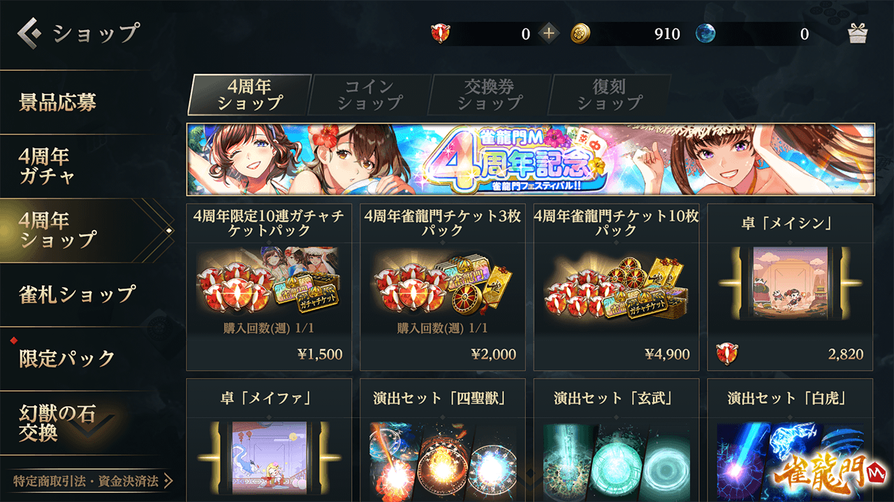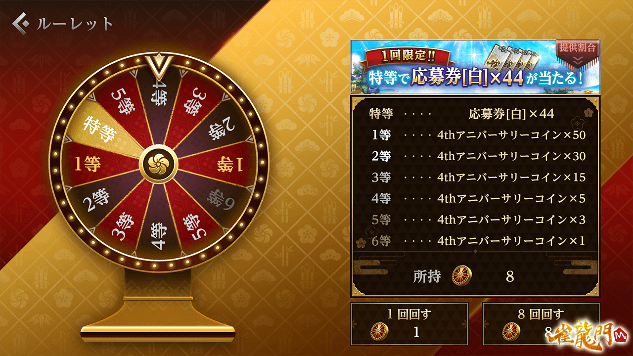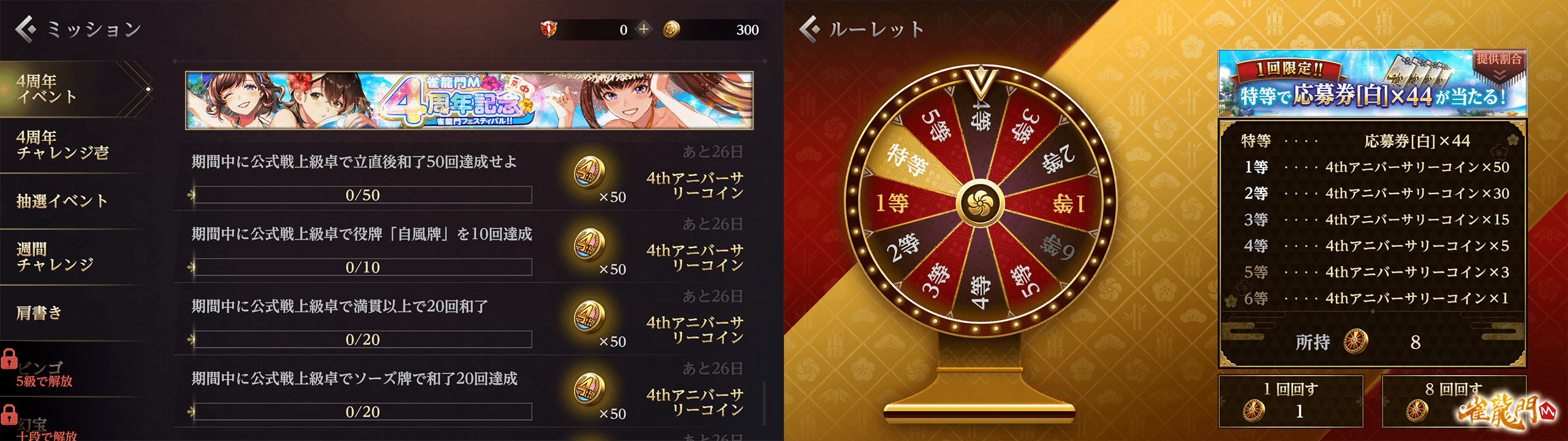 ※「4thアニバーサリーコイン」、「4周年雀龍門チケット」は、2024年9月10日(火) 23:59に削除されます。