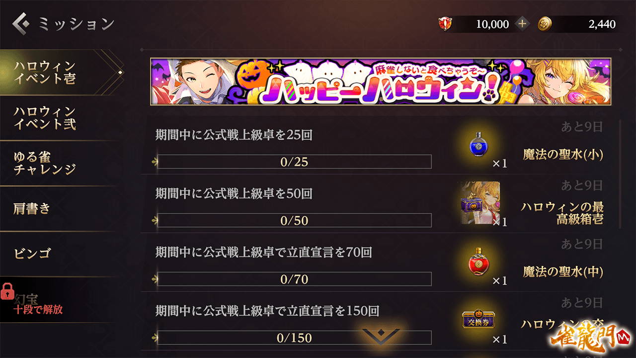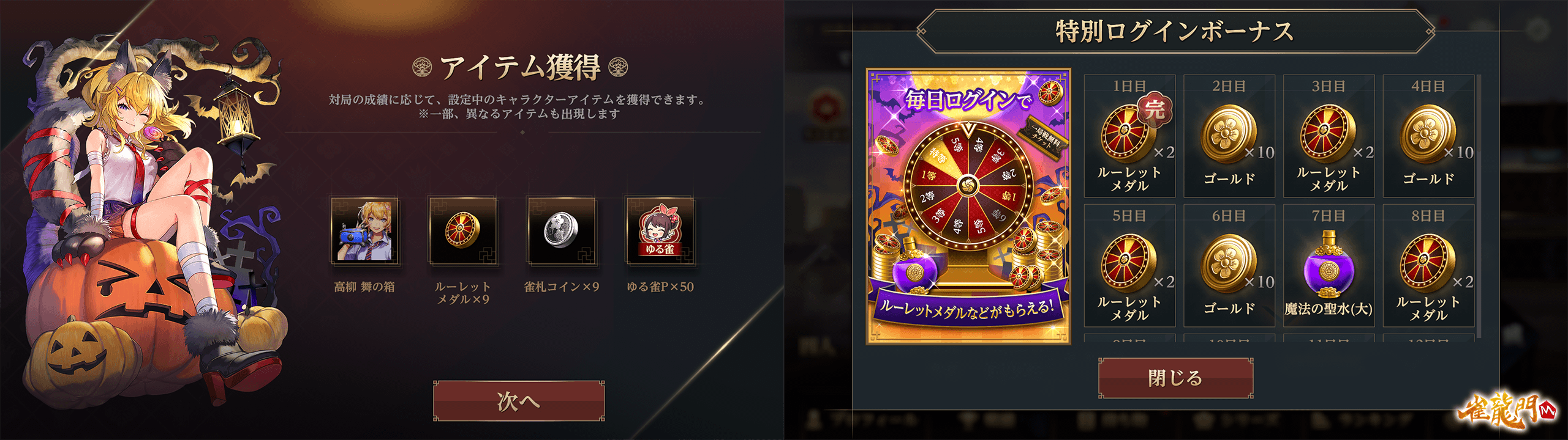 公式戦(上級卓)で獲得できる対局報酬のルーレットメダルが増加し、「ハロウィンのコイン」を獲得する効率が大幅にアップ!