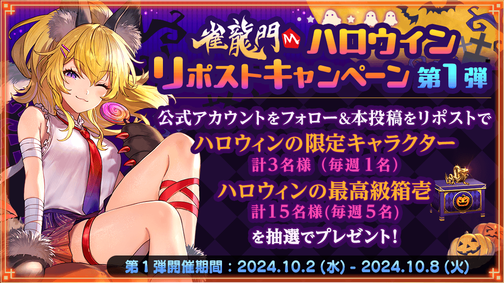 雀龍門MのX公式アカウントから投稿される当キャンペーンのポストをリポストして頂いた方の中から抽選でハロウィンイベント限定アバターなど豪華アイテムをプレゼントいたします。