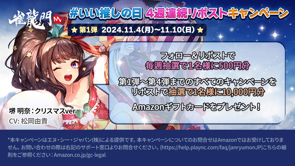 雀龍門MのX公式アカウント(@Janryumon_M)から4週連続で投稿される当キャンペーンポストをリポストすると抽選で4名様にAmazonギフトカード 500円分をプレゼント!
