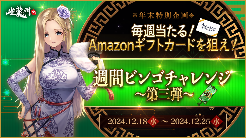 応募券[緑]を獲得したら「ホーム画面>ショップ>雀龍門M大抽選会>ビンゴチャレンジ第三弾」からご応募ください。
