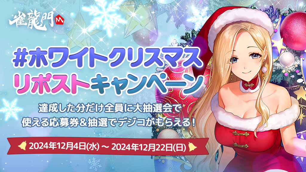 雀龍門M X公式アカウントから投稿される当キャンペーンポストのリポスト合計数に応じて、「[総額100万円分]雀龍門M大抽選会」で使用できる「応募券[白]」を全ユーザーに、デジタルギフト「デジコ」をリポストした方の中から抽選でクリスマスプレゼントいたします!