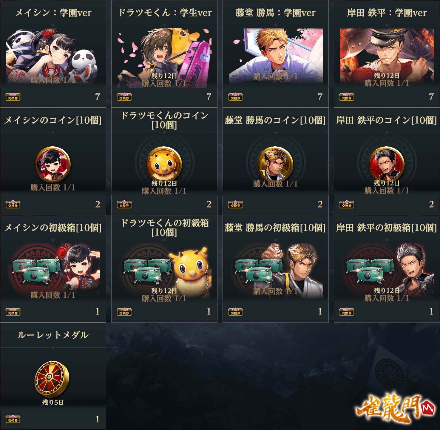 今回のイベントでは限定衣装の「メイシン:学園ver」、「ドラツモくん:学生ver」、「岸田鉄平:学園ver」、「藤堂勝馬:学園ver」を収集設定すると対局報酬で獲得できるルーレットメダルの数が通常の3倍に増加します!