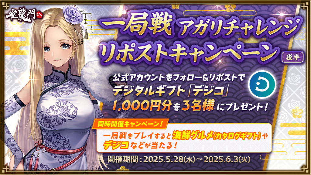雀龍門MのX公式アカウント(@Janryumon_M)をフォローし、当キャンペーンのポストをリポストすると抽選で3名様にデジコ1,000円分をプレゼントいたします。