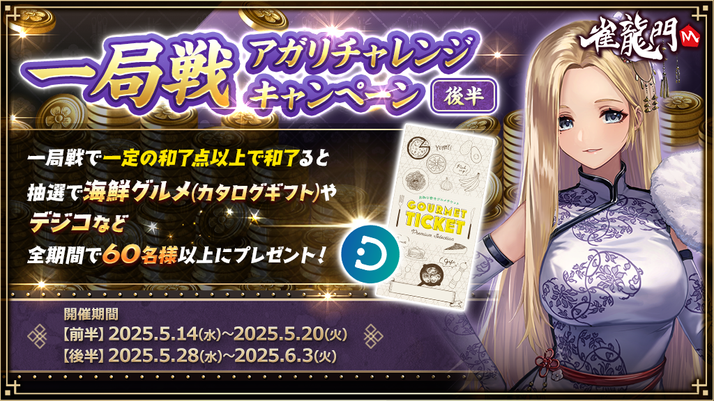 本キャンペーンは雀龍門Mの対局モード「一局戦」で一定の和了点以上で和了すると獲得できる「応募券」を集めて