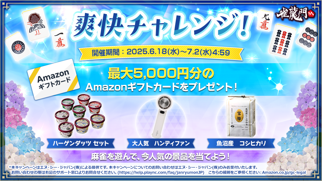 公式戦上級卓で対象のミッションを達成すると、総額6万円以上のAmazonギフトカード、最上級の魚沼産コシヒカリ、ハーゲンダッツ ミニカップセット、有名量販店のランキング上位にランクインするハンディファンを抽選で合計46名様にプレゼント!