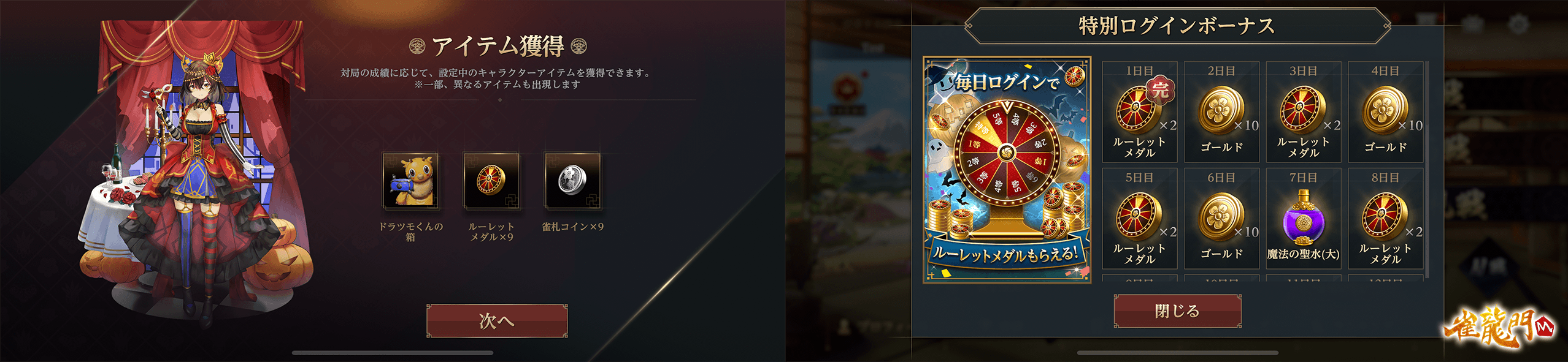 ルーレットを回すための「ルーレットメダル」は公式戦(上級卓)の対局報酬、ログインボーナスから入手が可能です!