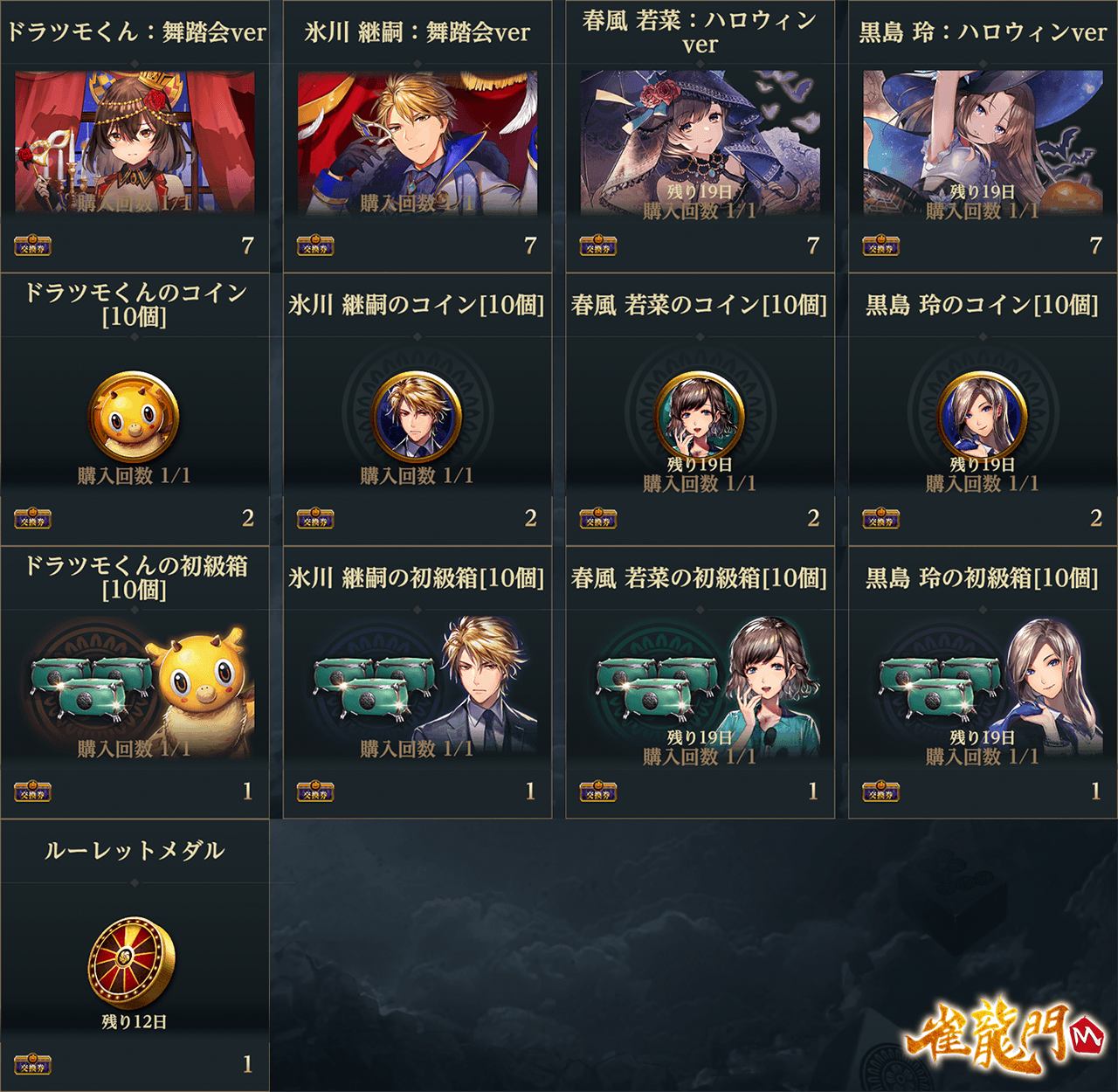 イベント限定キャラクターの「ドラツモくん:舞踏会ver」「氷川 継嗣:ハロウィンver」「春風 若菜:ハロウィンver」「黒島 玲:ハロウィンver」が再登場!