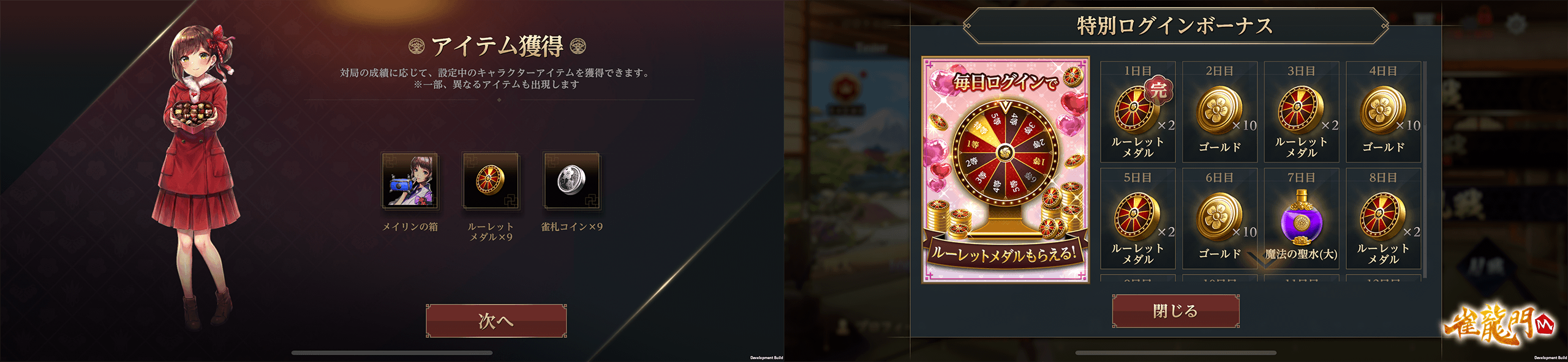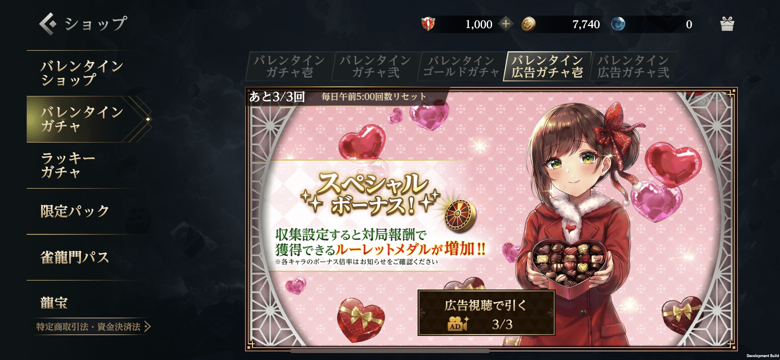 上記のバレンタインver以外の「メイリン」「ドラツモくん」「メイシン」「メイファ」「一条 凪」「高柳 舞」シリーズのキャラを収集設定すると、対局報酬で獲得できるルーレットメダルの数が通常の2倍になります!