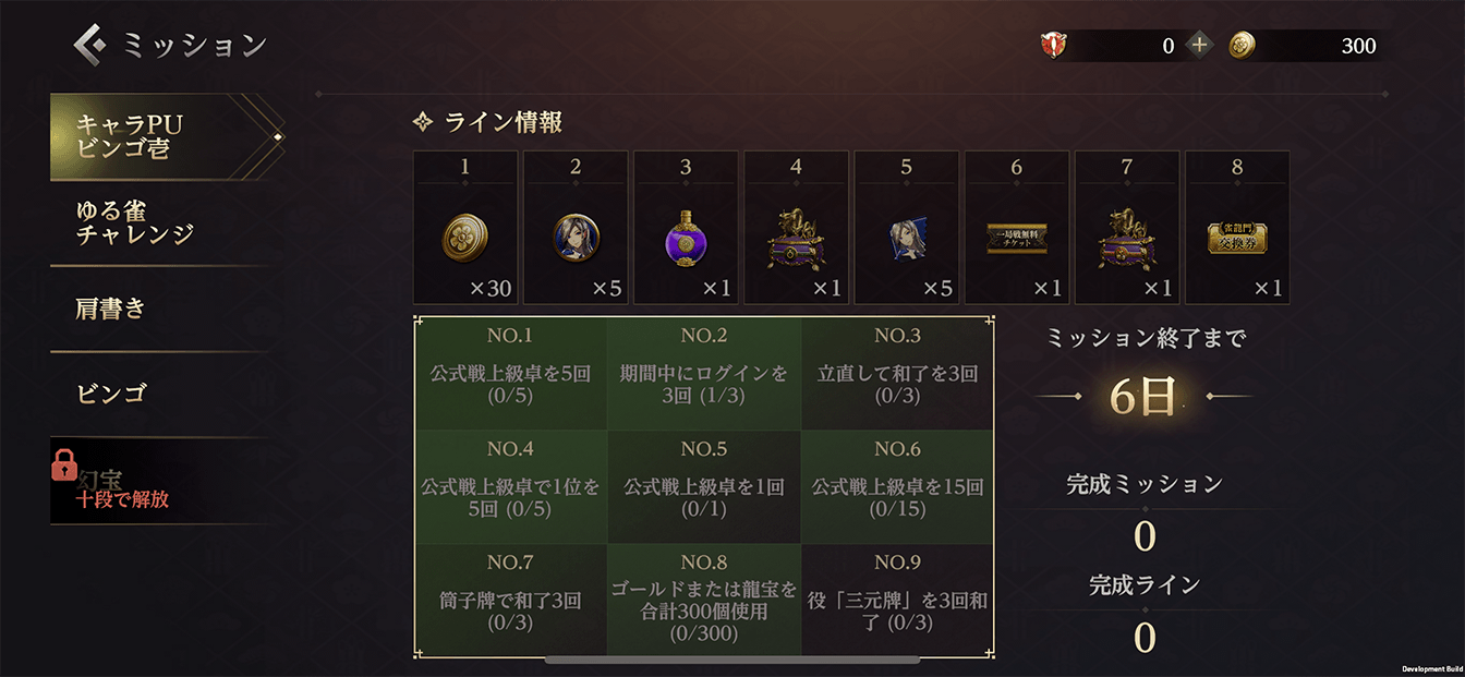 ビンゴミッションは9つのマスにそれぞれミッションが割り振られており、タテ・ヨコ・ナナメに並ぶマスのミッションをクリアすることでラインが完成し、完成したラインの数に応じて報酬を獲得できます。